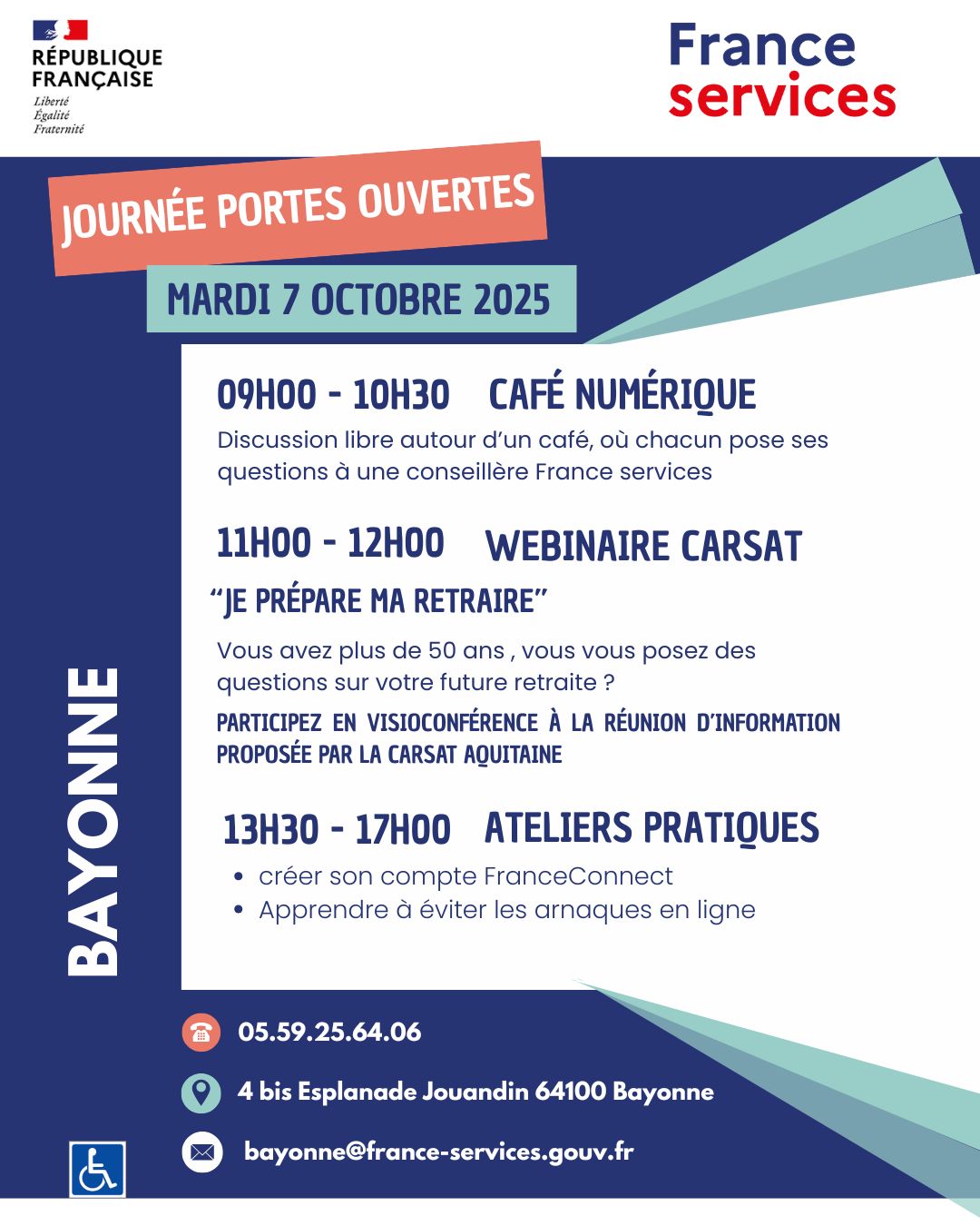 Votre France Services Bayonne et la Carsat Aquitaine vous proposent deux webinaires pour vous informer : le mardi 8 octobre de 11h à 12h : la Lire plus …admin a écrit un nouvel article il y a 1 an et 8 mois